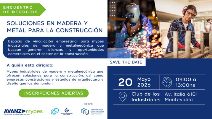 En el marco del programa Avanza Mypes, con el apoyo de la Cámara de la Construcción del Uruguay, se encuentra abierta la convocatoria a un encuentro de negocios orientado a promover oportunidades comerciales y vínculos entre empresas de los sectores madera, metalmecánica y construcción.